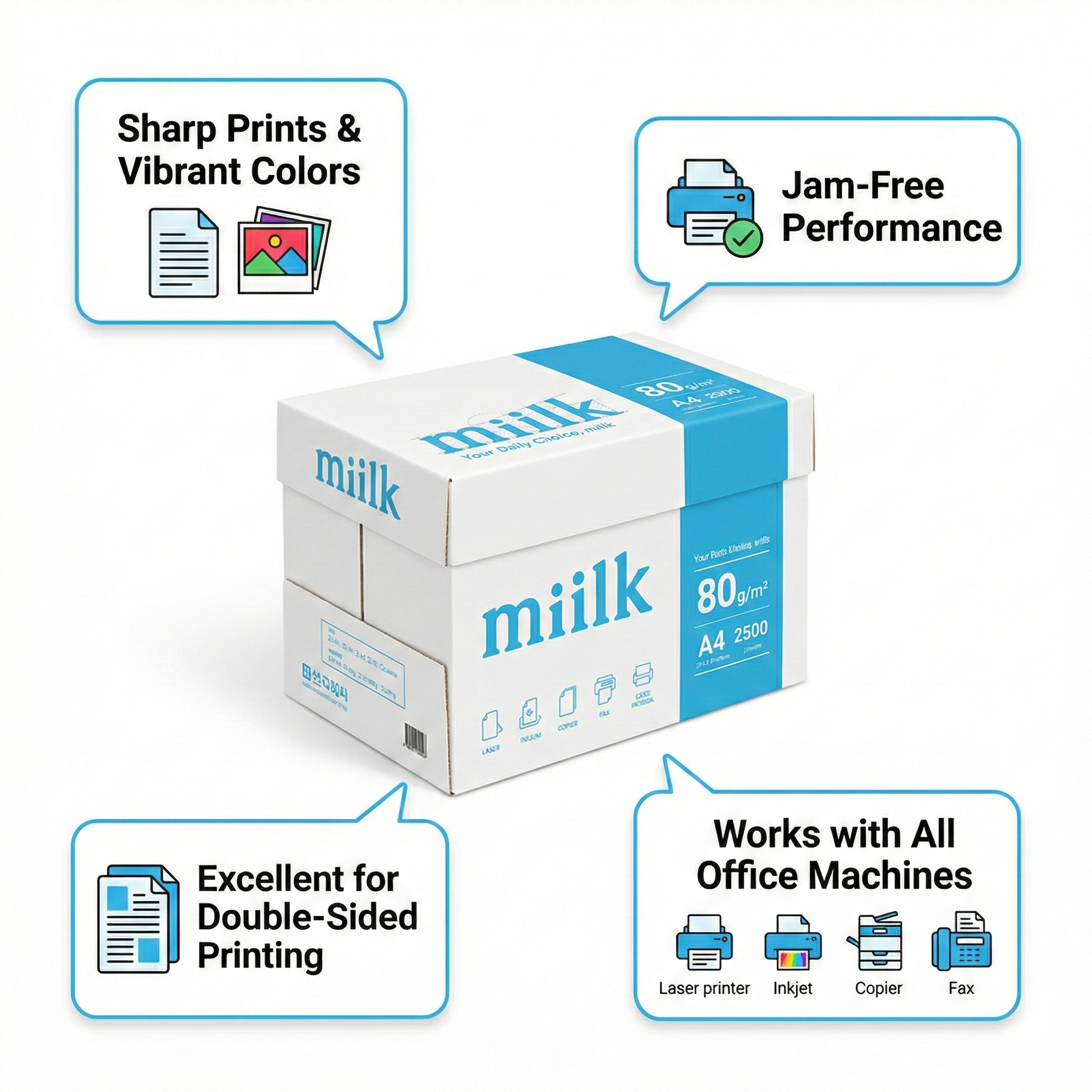With enhanced opacity, MIILK multi copying paper reduces show-through on double-sided prints, making it suitable for reports, presentations, contracts, and internal documentation. The bright white finish improves readability and visual clarity, ensuring your documents look polished and easy to review.